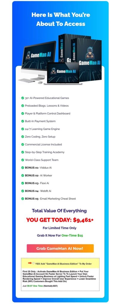 With its low entry cost, strong recurring revenue potential, and a robust set of built-in AI-powered features, Gameman AI stands out as a powerful solution for anyone looking to enter the fast-growing EdTech industry.